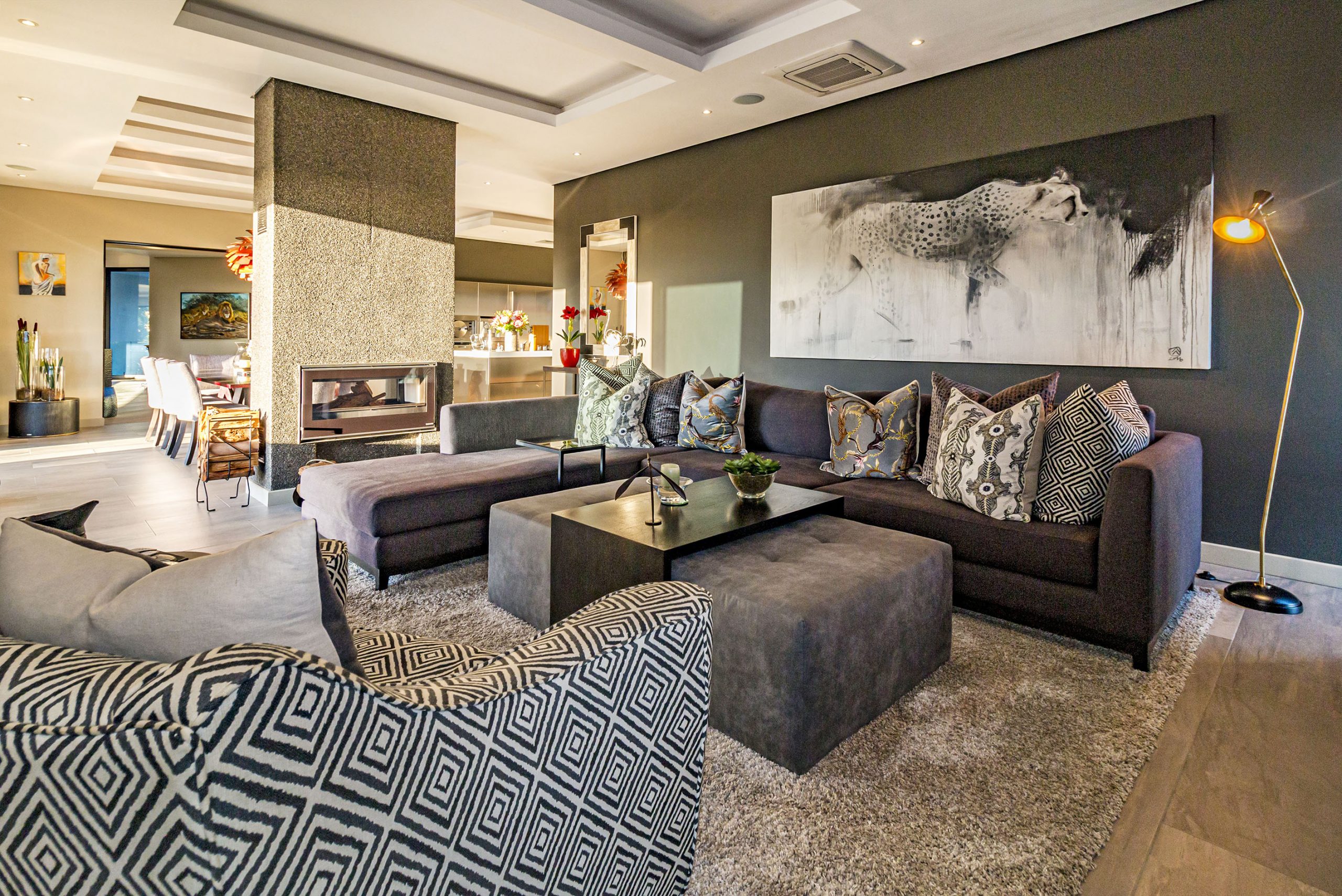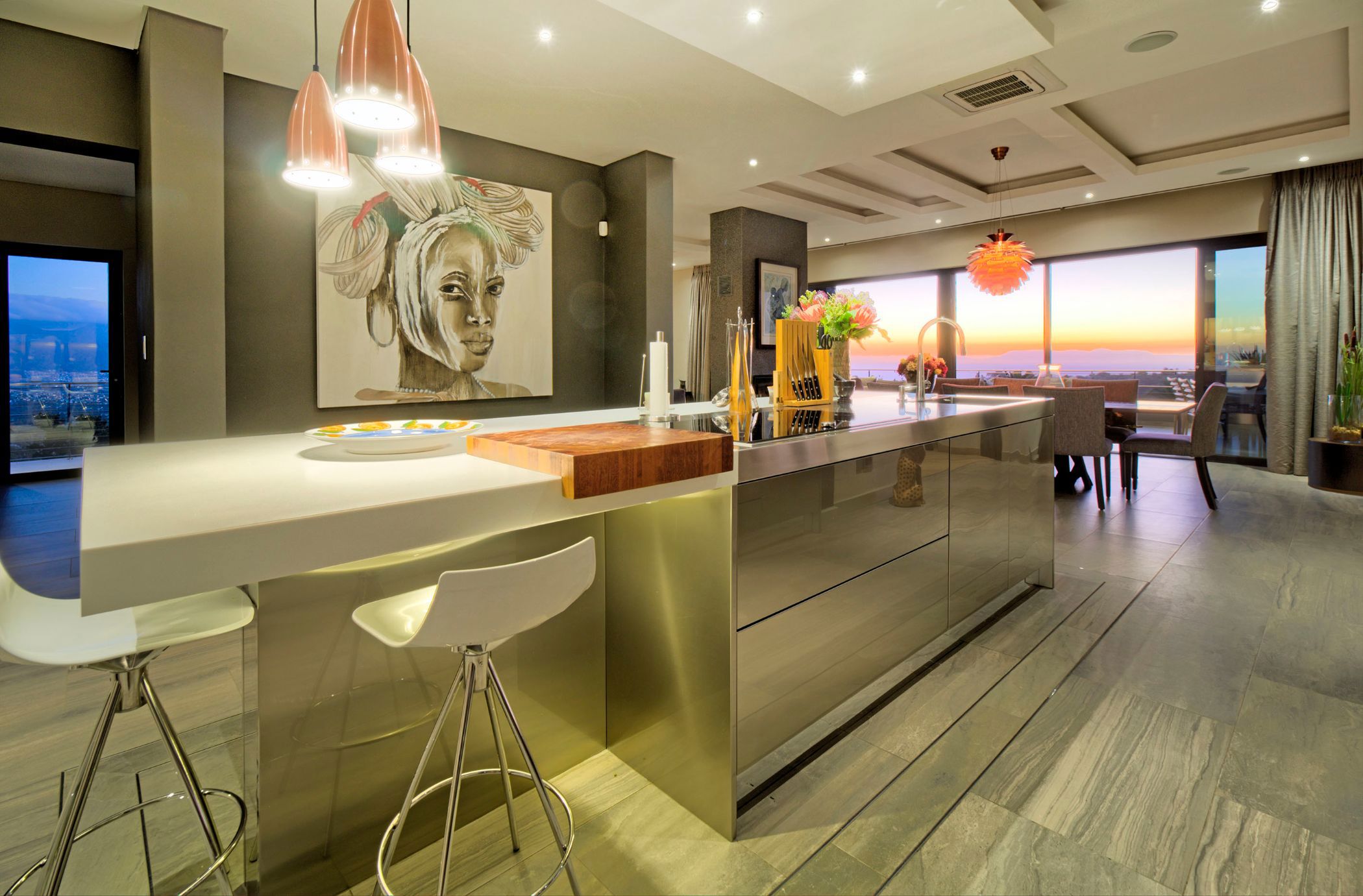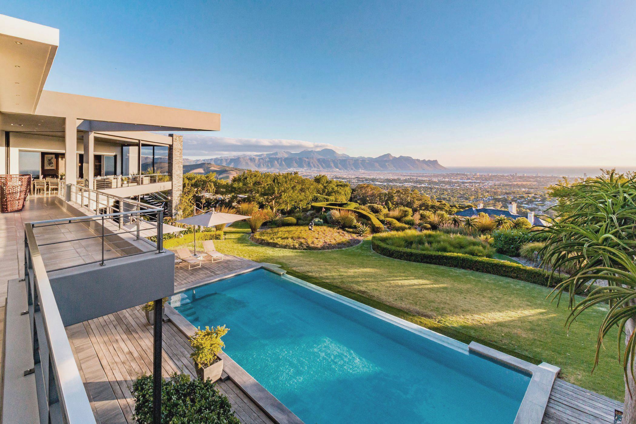 The innovative design of this landmark residence celebrates magnificent Helderberg mountain and False Bay views, blending indoor spaces with the natural beauty of the surroundings.