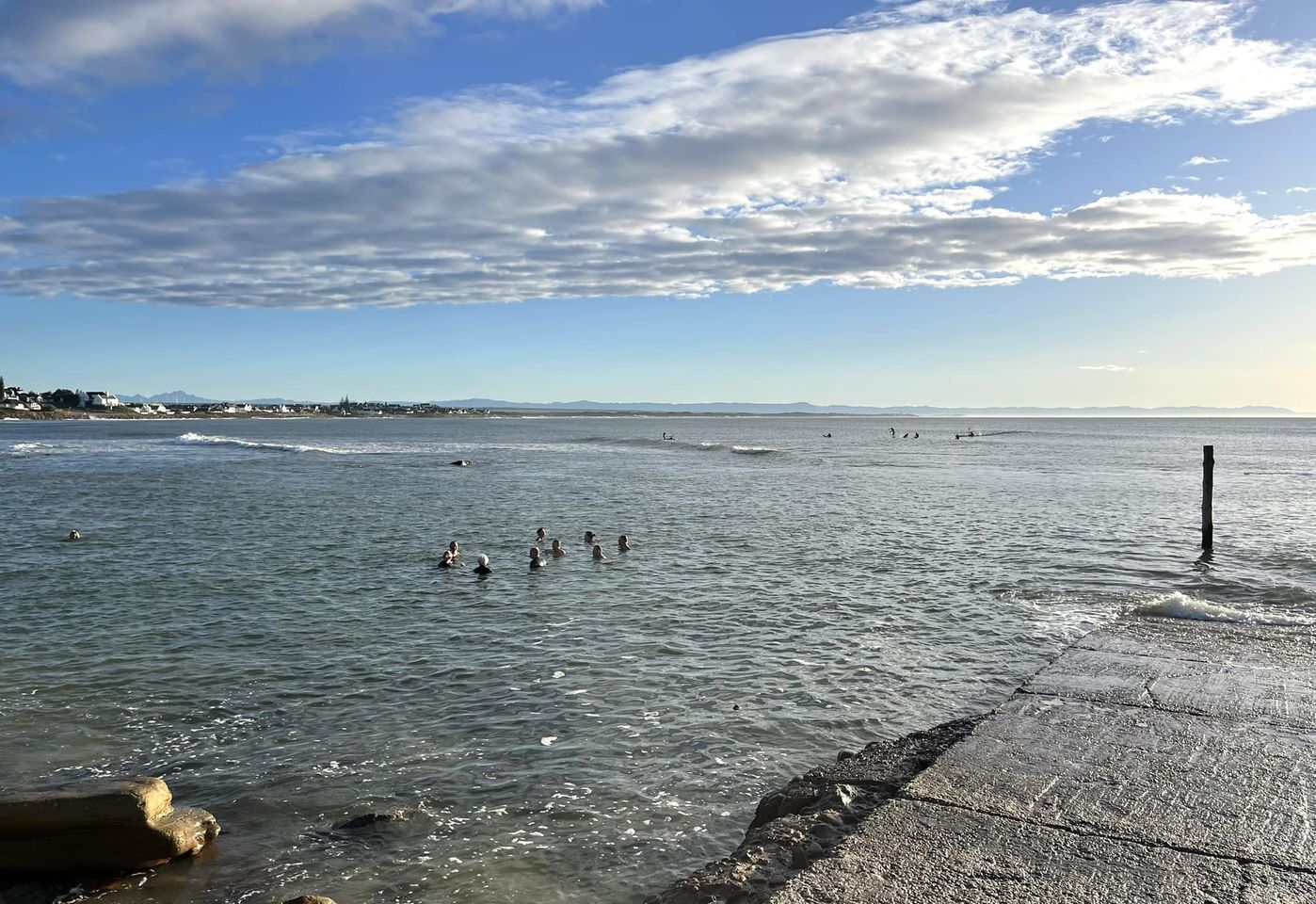 “Talking Heads”: the 7.30 daily swimming group at grannies this morning with a few surfers at Huletts behind