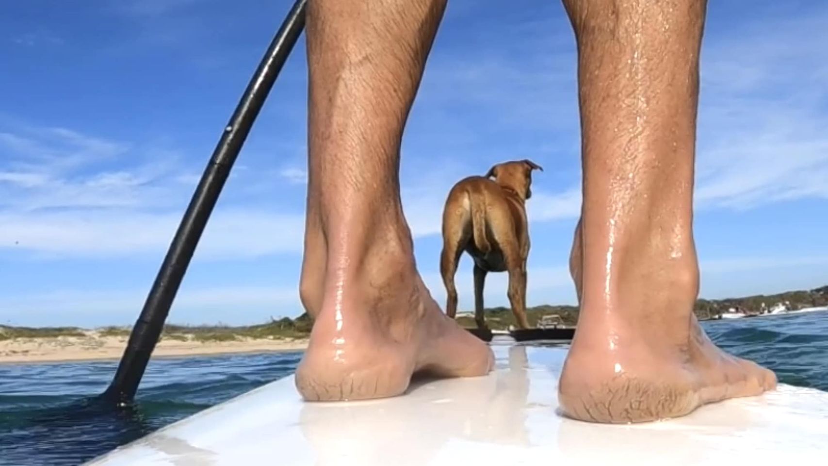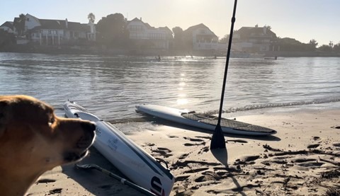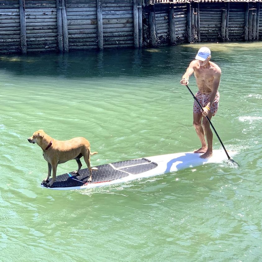 Raffy and I are SUPing regularly , struggling to keep up with Janey on her new light fast Carbonology Boost Thanks Ian Watt for the photo . … ” A man and his dog … a familiar sight going past our house Richard Arderne and his dog who loves paddling as Richard maintains his balance”