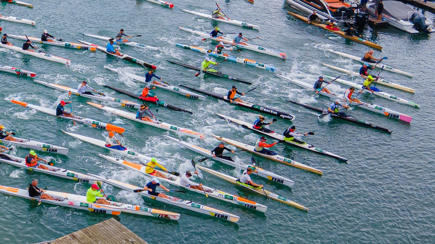Great photo by Gibbo, paddlers putting in max effort at the start, despite still 21km race up the river to go Green Pam Golding logos on the front of all the boats I’m in the blue and white vertical striped surfski, middle top
