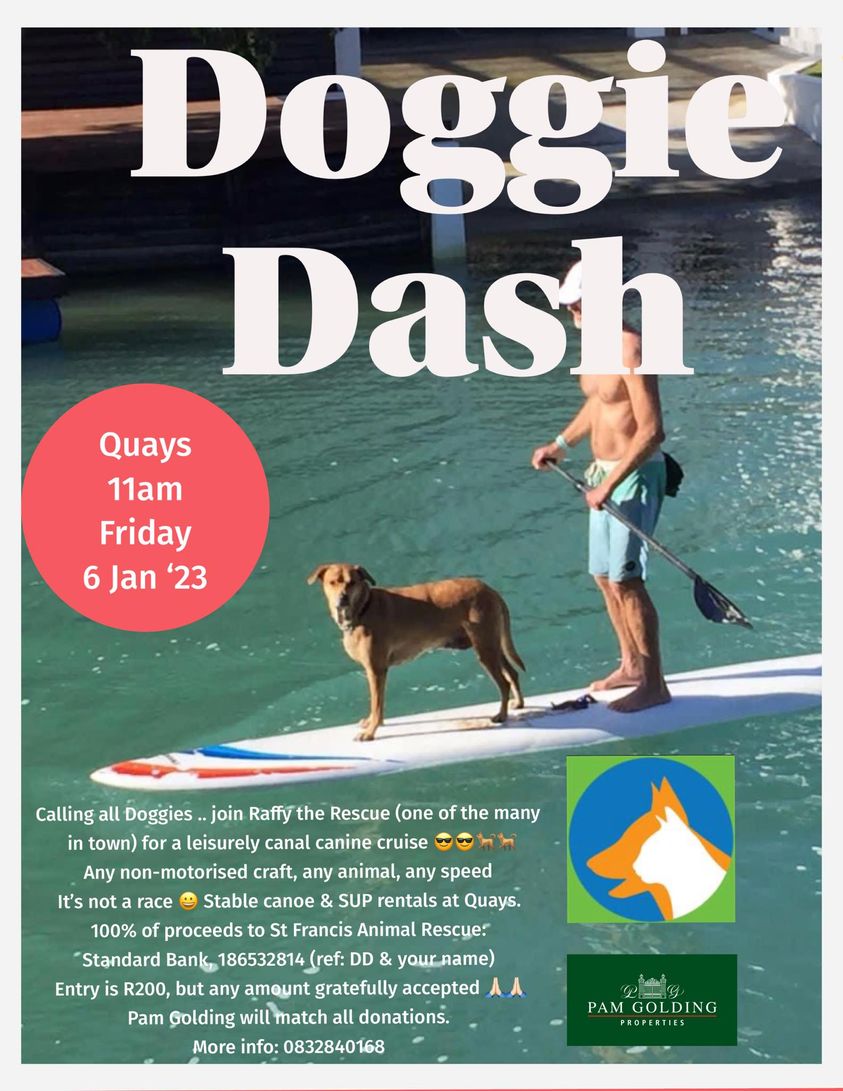 The first Doggie Dash .. some dogs on craft, some dogs just barking Over R10,000 raised for St Francis Animal Rescue (Sue Rae Fox and Jenny Pike) with Quays and Pam Golding agreeing to match all other donations. We all had fun .. especially Raffy