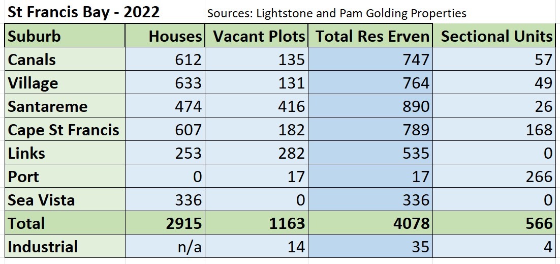 As we recently reported, we carefully counted all the houses in St Francis Bay, including the Links, Cape St Francis and Sea Vista, using Google Earth photos (dated May 2022) and our answer was 2915 houses (out of 4078 residential erven). In addition, there are 566 sectional title units, giving a total of about 3500 residential units. See table below.