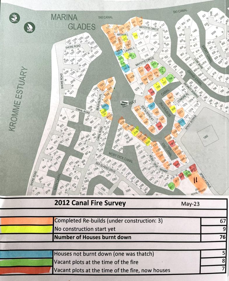 76 houses burnt down on 11 November 2012, ten and a half years ago, sparking a building boom, with an amazing 38 re-build starts within 12 months, and 51 within three years. And now in 2023, 67 houses have been re-built …. only one with thatch. (Five houses survived the fire …. only one with thatch)