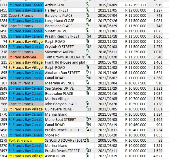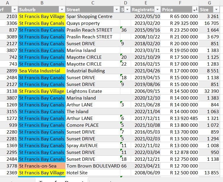There have been 54 St Francis Bay Property Sales of R10m or more : 47 of them residential and 7 commercial/development/industrial (highlighted in yellow on the spreadsheet). The first sale over R10m was in 2005, then there were none from 2008 to 2012, and half of the 54 in the last three years!