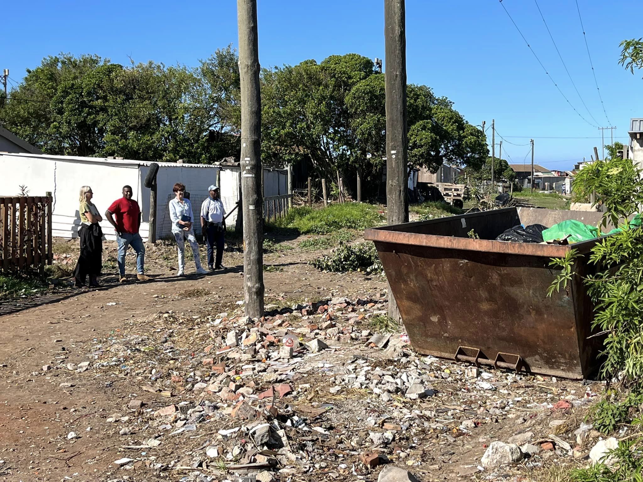 I had a walk through Sea Vista this morning to see the positions of the eight refuse skips with some municipal officials and the Kromme Trust representative Stella Plantinga . The officials discussed possible additional skip positions, more regular replacement of skips (before they are full), and a possible employee at each skip to manage the process. Also the clean-up of sites where refuse has been dumped due to skips being too far apart. Another problem is narrow streets, with electricity cables needing to be raised for refuse trucks to be able to fit through.
