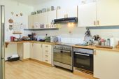 - Kitchen with hob, hot water cylinder, laminate wood floors, melamine finishes, oven and hob and pantry